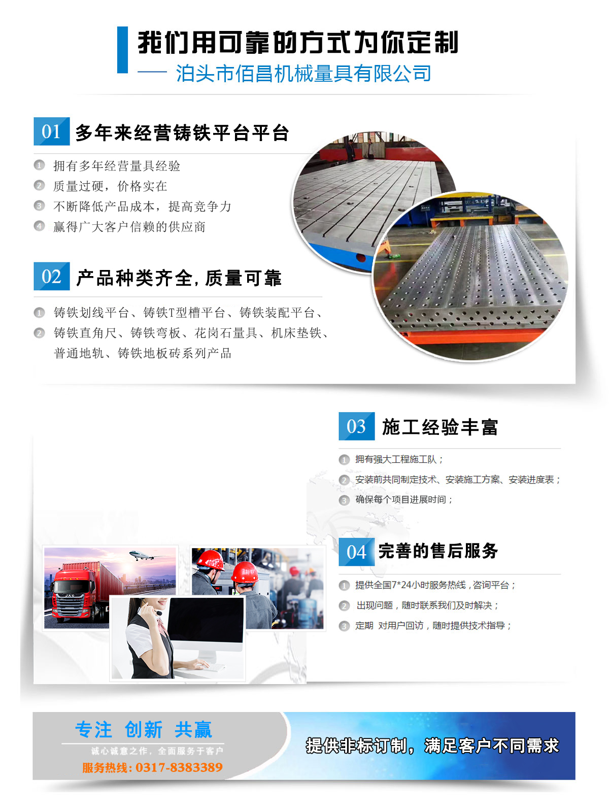 泊頭市佰昌機械量具有限公司坐落在有“鑄造之鄉”美稱的泊頭市,我公司自創(chuàng)建初期堅持誠信原則和不斷創(chuàng)新的原則,_為廣大用戶提供鑄鐵平板鑄鐵地板,劃線平臺等放心產品,我們的產品_程度高,得到了廣大用戶的高度認可。